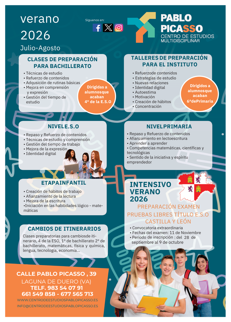 Conscientes de que el verano con la inclusión de la nueva LOMLOE es una época clave en el refuerzo, asimilación de contenidos que palien todas las carencias que se han dado durante el curso, nuestro centro ofrece clases y cursos, para que los alumnos se enfrenten a su siguiente nivel con todas las garantias.